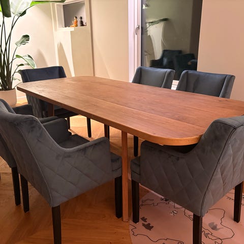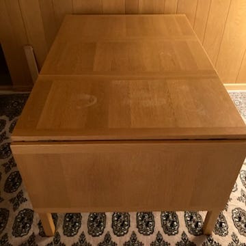Sæbebehandlet spisebord i egetræ 220x100 i meget god stand samt 1 stk tillægsplade 50 cm. Skal afhentes