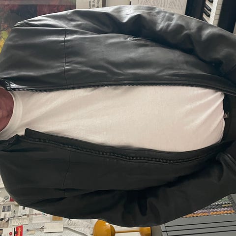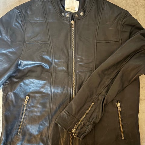 Samsøe Samsøe Jakke i sort læder, størrelse M til mænd. Jakken er designet til udendørs brug og har en enkel, klassisk stil.