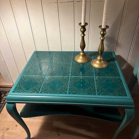 Søgeord: grøn, turkis, grønblå, blågrøn, mintgrøn, sofabord, sidebord, træbord, malet, vintage, retro.