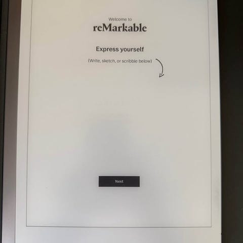 reMarkable 2 e-ink tablet i grå farve. En digital notesbog og læser med e-ink skærm, der efterligner papiroplevelsen. Indeholder marker plus pen, ekstra stifter, reserve pen, opladerkabel og stofcover. Velegnet til notetagning, læsning og dokumenthåndtering.