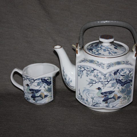Kinesisk tekandesæt bestående af en tekande med træhåndtag, fire små glas kopper samt en træbakke. Tekanden og kopperne er fremstillet i glas med et mørkt, røgfarvet design. Træbakken har riller for dræning og er lavet af træ.