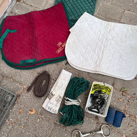 Forskelligt hesteudstyr, herunder bid, grime, tøjler, sporer, sadler og diverse tilbehør. Materialerne inkluderer læder og metaldele. Sættet indeholder flere størrelser og farver, primært sort og rød. Velegnet til brug ved ridning og træning af heste. Priser er fra 50 kroner ellers kom med en pris.