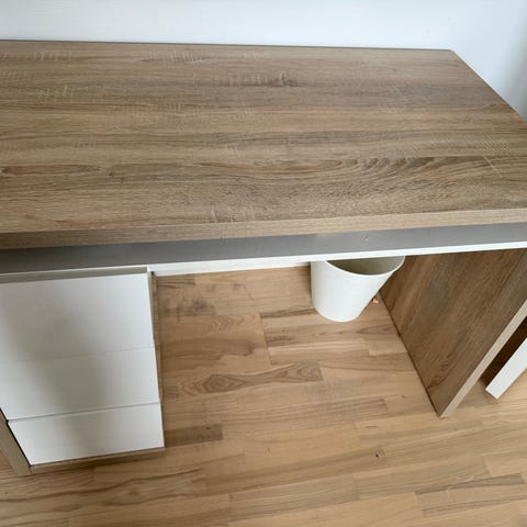 IKEA skrivebord med skuffer i hvid og trælook. Bordet har en overflade med træstruktur og flere opbevaringsskuffer. Velegnet til kontor- eller arbejdsrum.