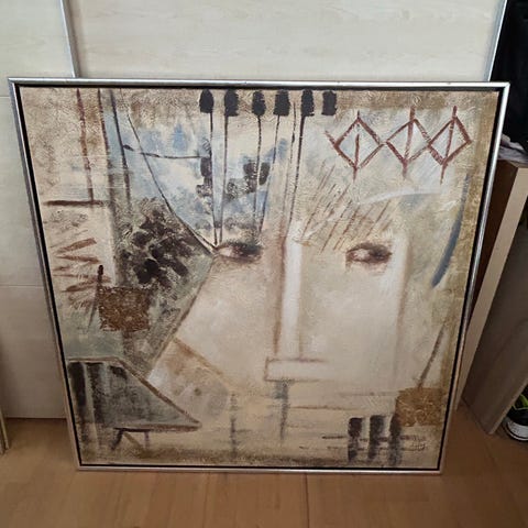 Abstrakt maleri i ramme med farverne blå, grøn, gul, hvid og sort. Maleriet er monteret i en sølvfarvet ramme og er velegnet til vægophæng som dekorativt element.