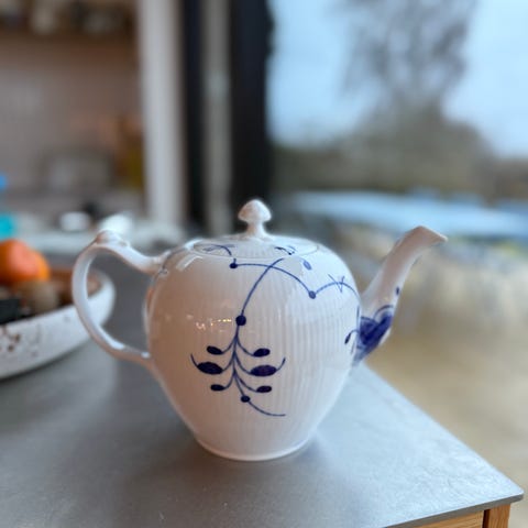 Royal Copenhagen tekande med låg og hank. Tekanden er dekoreret med sort mønster på hvid baggrund og er fremstillet i porcelæn.