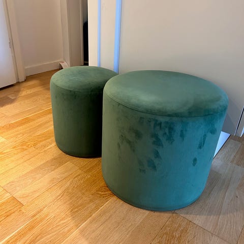 Den midterste pude er i teddy stof på forsiden i naturfarve, de to andre puder er i bomuld i en gullig/naturfarve.