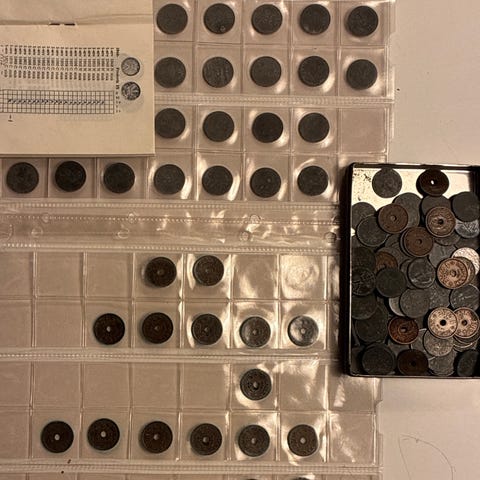 Samling af danske mønter bestående af 1 øre og 5 øre i forskellige årgange og tilstande. Mønterne er lavet af metal og varierer i størrelse og farve afhængigt af årgang.
