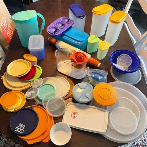 Tupperware køkkenudstyr og opbevaringsbeholdere i plast i forskellige farver, brugte men stadig gode og minder fra mors køkken som ikke kan købes mere