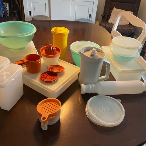 Tupperware køkkenudstyr og opbevaringsbeholdere i plastik i forskellige farver og størrelser. Der er nyt æggeur og ekstra låg