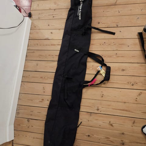 SkatePro skitaske til langrendsski, den kan indeholde 2 par. Tasken har en længde på 213 cm og har to kompressionsstropper på ydersiden, (den ene er gået i stykker). Der er en skulderstrop og en håndtagsstrop i den ene ende. Lynlås i fuld længde. Tasken har aldrig været brugt.
