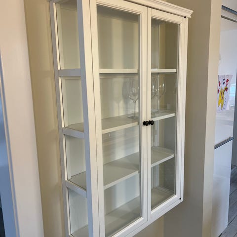 Flot, hvidmalet vitrineskab til ophæng. Glas på front og siderne og med flot buet top. Pæn stand uden skrammer.