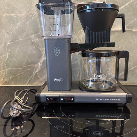 Moccamaster kaffemaskine med glas kande. Kaffemaskinen er designet til brygning af kaffe og har en gennemsigtig vandbeholder og en glas kande til opsamling af den bryggede kaffe.