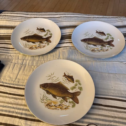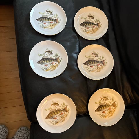 Bavaria Waldsassen porcelæn tallerken med dekorativt fiskemotiv. Tallerkenen er rund med en diameter på cirka 20 cm. Egnet til servering og som dekorativt element i hjemmet.har 2 stk begge for 200