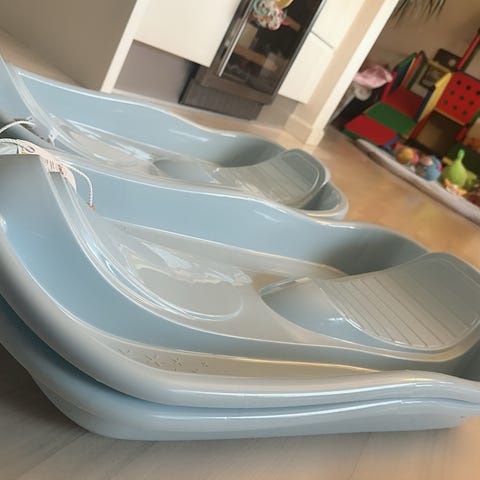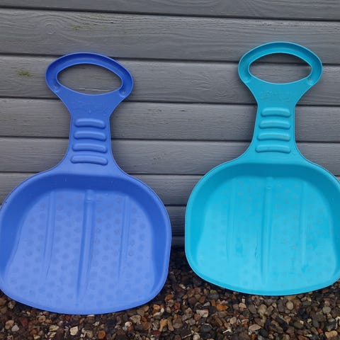 Stiga Dantoy kælk i blå farve. Kælken er lavet i plastmateriale og er designet til børn. Den har et simpelt design med ribber til fodstøtte og en snor til træk.