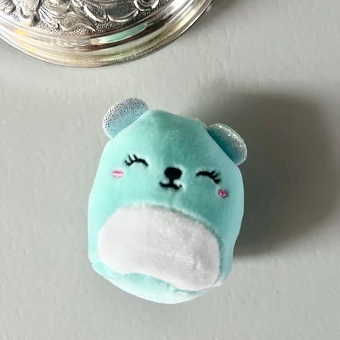 Squishmallows bamse Puddel? i lyserød plys med rund form og bløde teksturer. Den er nuttet og blød.