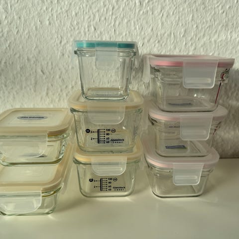Der er to af hver i alt 6 stk til 100kr Iittala glas opbevaringsbokse i forskellige former og størrelser. Sættet indeholder både runde og firkantede bokse med låg, designet til opbevaring af små genstande eller madvarer. Fremstillet i klart glas med et mønstret låg for nem håndtering.
