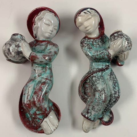 Keramisk figur, der forestiller et barn, der holder en hund. Figuren har en mosaiklignende overflade med brunlige og hvide nuancer. Michael Andersen, Bornholm Mærket 4741 samt tre fisk i triangel. Højde 15 cm.