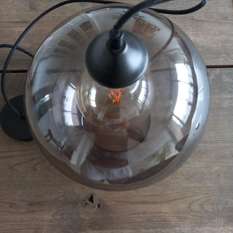 Diameter 25 cm, Røgfarvet glas, Med pære, Sort stofledning der måler 2,90 m.