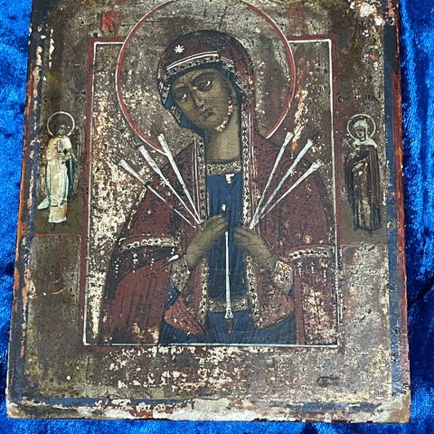 Kopi af russisk Ikon Guds Moder af Vladimir. Originalen er fra 1130 og er i dag i Tretjakov-galleriet. Personerne ude i siden er helgenerne Konstantin og Helena. Bagpå er der en seddel med finsk tekst med oplysninger op Ikonets historie måler 10x12,5cm og 1cm tyk. Fin stand. Det lille staffeli medfølger ikke. Pris kr 85