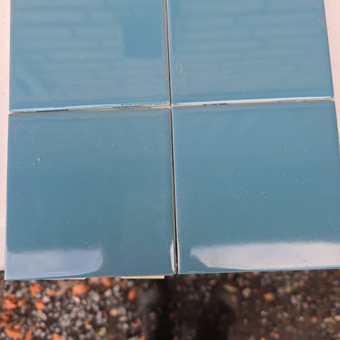 Fliserne er i fin stand, dog med rester af fliseklæb bagpå, som jeg forestiller mig nemt kan fjernes.