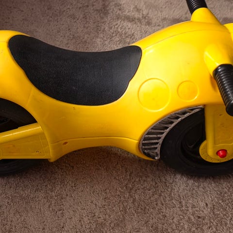 Dantoy løbecykel i rød og blå farve med fire hjul. Designet til børn til at øve balance og motorik.