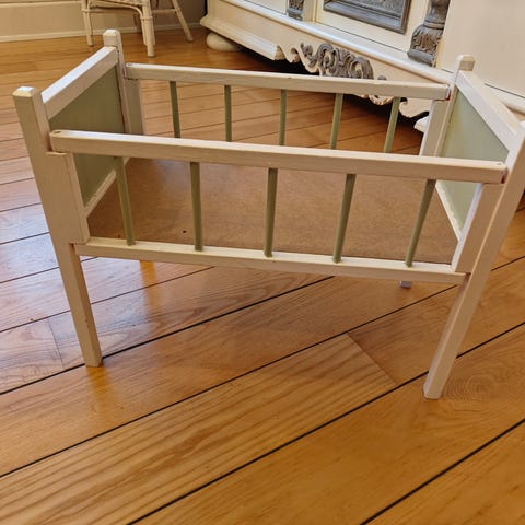 Smuk gammel dukkeseng fra 60’erne sælges med håndsyet dyne, pude og olmerdugs madras.