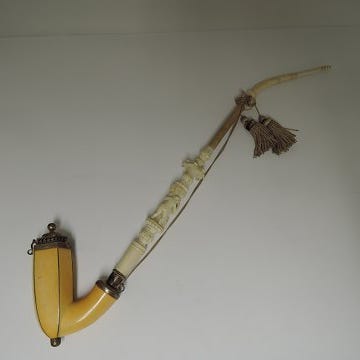 Smuk stor merskumspibe, 65 cm lang. Velbevaret. Sølvlåg med lille relief af kvinde. Smukt håndværk. Oprindelige fra gård på Falster.
