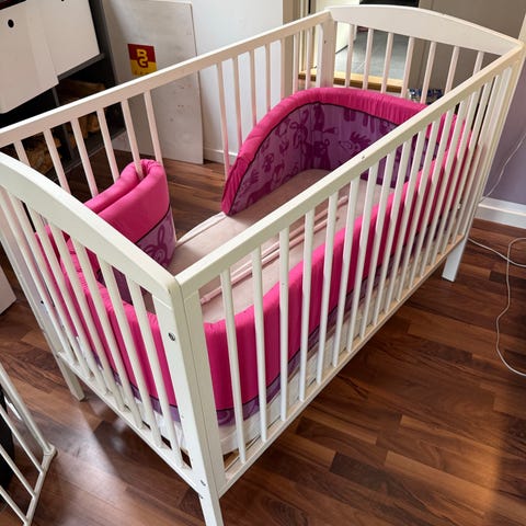 Tremmeseng i hvidt træ. Egnet til små børn og spædbørn som en sikker soveplads.