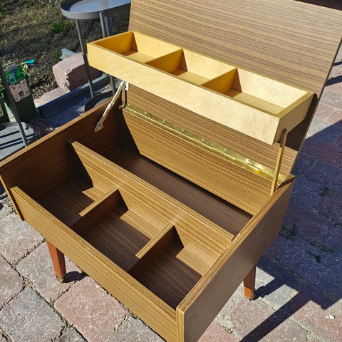 Gammelt vintage sybord med hulrum til opbevaring i midten. Og mindre opbevaringsrum øverst. Med låg/bordplade der lukkes. Velourstof om opbevaringsdelen.