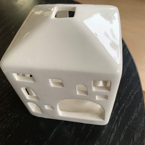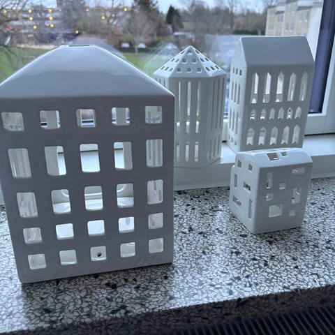 Kähler Fyrhus keramiklanterne i hvid farve. Designet som små fyrhuse med firkantede vinduer. Velegnet til dekoration og belysning i hjemmet.