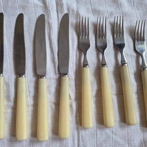 18 dele bestik / service af ældre dato vintage / retro i rigtig god stand. Flest knive. Gafler og ske i pletsølv. Bestående af forskellige knive, gafler og skeer. Bestikket har håndtag i flere farver og materialer, herunder ben og plast.