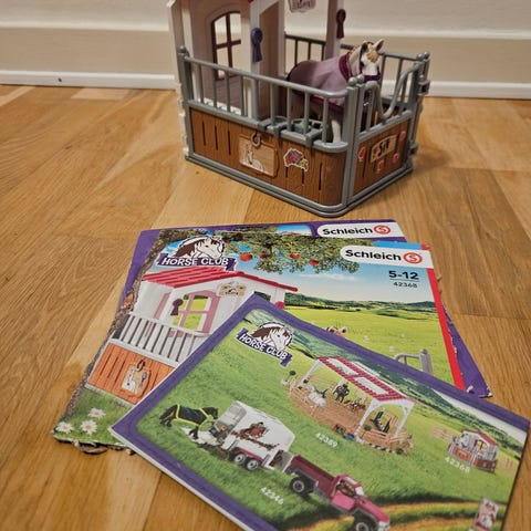 Min datter sælger ud af sit Schleich Horse Club. Generelt i god stand, men der kan være enkelte mærker eller ridser. Primært på dyrlægens hoved og hvide hest.