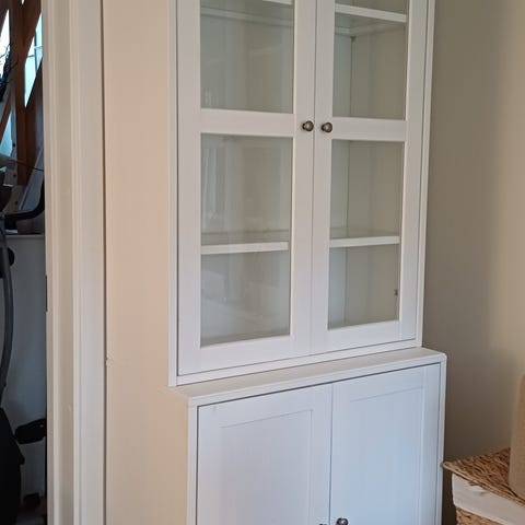 Hvid Havsta vitrineskab, med skydelåger, fra Ikea.