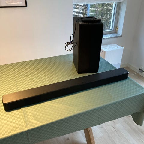 LG soundbar med trådløs aktiv subwoofer. Systemet inkluderer en soundbar og en trådløs subwoofer, som begge er i sort. Soundbaren har Bluetooth-forbindelse og giver meget bedre lyd end TV højtaleren.