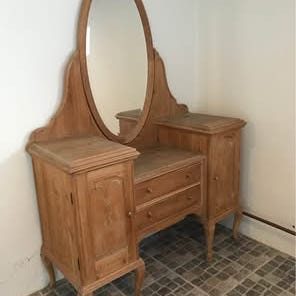 Dette er et antikt toiletmøbel, også kendt som et sminkebord eller vaskestativ, typisk lavet af fyrretræ. Det har et stort, ovalt drejespejl, to skabe og skuffer til opbevaring, hvilket giver både elegance og praktisk anvendelse i et soveværelse eller påklædningsrum.