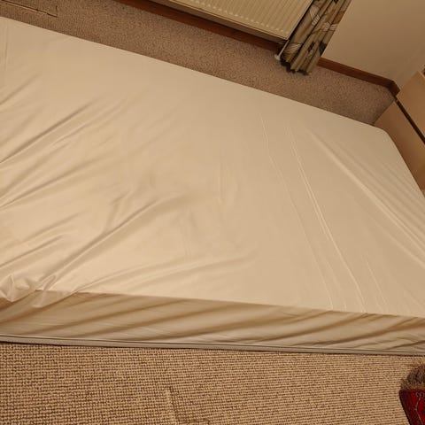Auping madras med betræk i lys farve. Madrasserne er brugte og har synlige brugsspor. De er designet til at give støtte og komfort ved søvn.