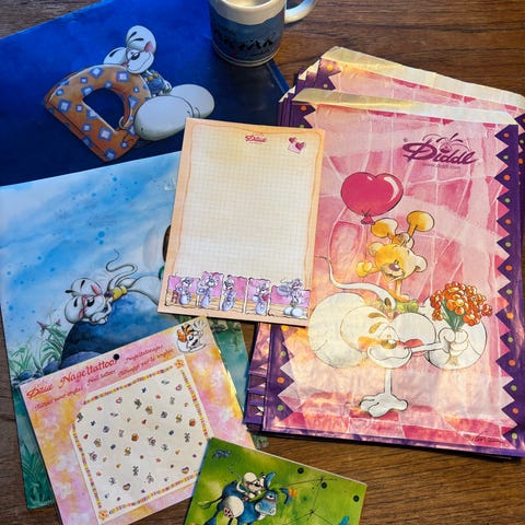 Diddl papir og kuverter med forskellige designs og farver. Det hele sælges til 300 kr.