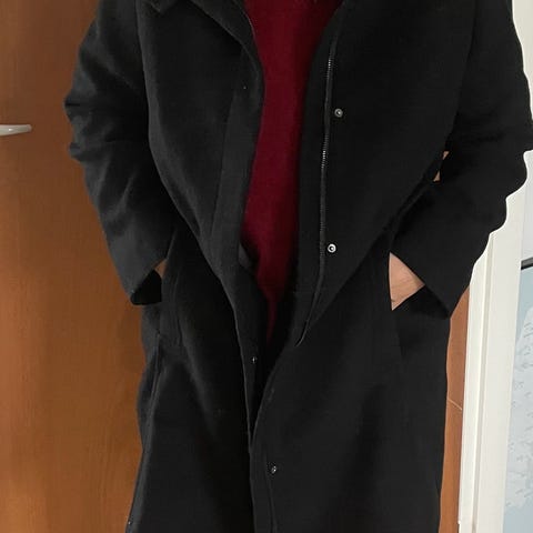 Esprit sort frakke med pels kant på hætte, med lynlås og knapper.