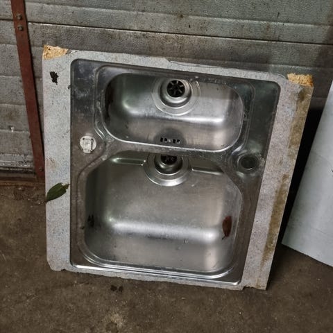 Køkkenvask med dobbelt skål i hvid porcelæn. Vasken har to separate vaskeområder med afløb.