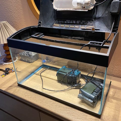 Akvarium med tilhørende filter og dekorative elementer som kunstige planter og sten. Egnet til opdræt og opbevaring af ferskvandsfisk. Indeholder elektrisk pumpe til vandcirkulation og iltning. Og en masse ekstra udstyr. F.eks. grus, varmelegeme etc.