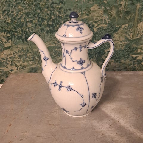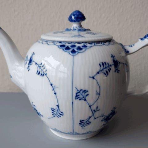 Royal Copenhagen Musselmalet tekande med låg i porcelæn. Tekanden har det klassiske blå blomstermønster på hvid baggrund. Tekanden har en lille skade ved tudens kant, som ses på billederne.