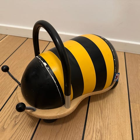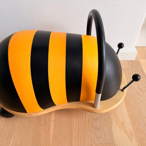 Den lille model, af den prisvindende originale håndlavede Wheely Bug Bi, er en fantastisk skubber/gåbil. Det unikke ved Wheely Bug fremfor lignende legetøj er, at hjulene kan dreje rundt i 360 grader, så der altid kan være fuld fart på legen med den lille bi. Dette udfordrer blandt andet barnets grovmotorik, afstandsbedømmelse og koordination.