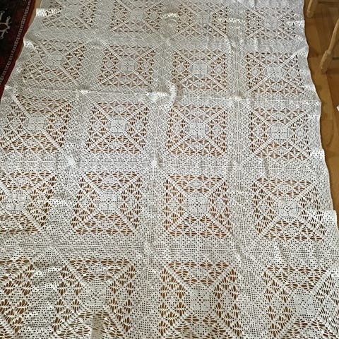 Hæklet tæppe / dug i hvid bomuld. Ca. 160 x 140 cm. Intakt.