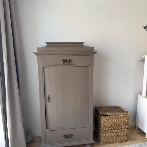 Byd! Karlekammerskab med hjemmelavede solide hylder. Skabet fungerer godt men har synligt patina flere steder og ødelagt maling på den ene side, så den skal måske stå op ad en væg.