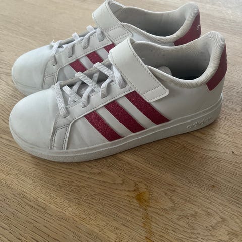 Adidas børnesko til pige i størrelse 34. Skoene er pink med hvide detaljer og har en gummisål. De lukkes med tre velcroremme for nem justering og pasform.