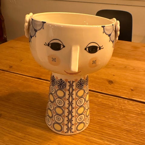 Bjorn Wiinblad vase med hvid base og blå dekorative mønstre. Vasen har en unik form og er designet med ansigtsdetaljer. Materialet er keramik.