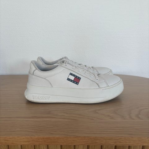 Tommy Hilfiger sneakers i størrelse 38. Skoene er grønne med hvide såler og snørebånd. Materialet fremstår som tekstil og syntetisk. Designet er til hverdagsbrug og har en høj sål med mønster på undersiden.