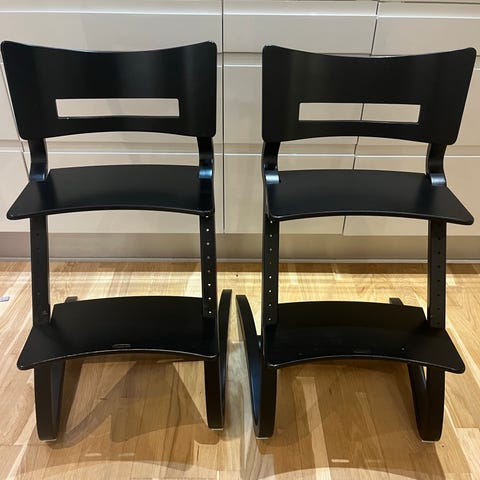 Leander højstol i sort farve. Designet til børn med justerbar sæde- og fodstøtte. Fremstillet i træmateriale. Velegnet til brug ved spisebordet for børn.