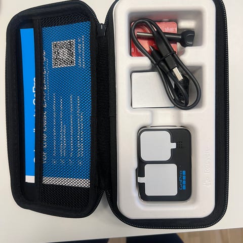 Der medfølger 64gb SD og adapter til SD kortet, til at sætte i computeren. Og ellers alt der er på billedet i tasken medfølger.