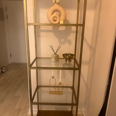 Flot og stilrent konsolbord i guld/messingfarvet metal med flere hylder. Perfekt til entré, stue eller som dekorativ reol. Står stabilt og i pæn stand.